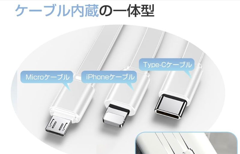 ケーブル忘れの絶望感、もう味わいたくないんですよね。プラグ内蔵型なら壁に刺すだけで充電できるので、出先のカフェでも困りません。