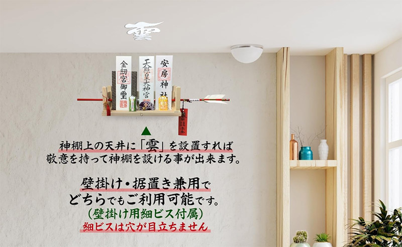 棚板と鳥居、そして天井に貼る「雲」の文字がセットになった入門パッケージです。 白松の明るい木色で部屋が重くならず、初めての神棚としても取り入れやすい内容です。