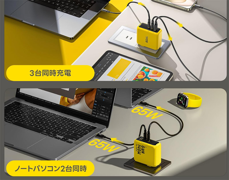 | AOHI 140W 3ポート | 140W | USB-C×2 + USB-A×1 | ★★★☆☆ | ★★★☆☆ | ★★★★★ |