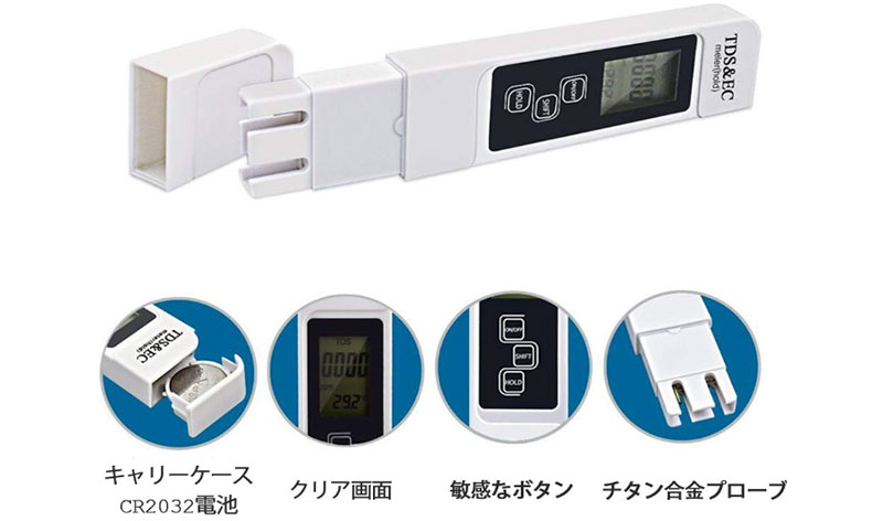 携帯型ではなく、浄水器に常設するタイプというのが他の4機種と毛色が違うところです。 入水と出水の両方を常時監視できるので、フィルター交換のタイミングが感覚ではなく数値で出てきます。 水耕栽培用のRO浄水器を回している知人に勧めたところ、フィルター寿命の判断がブレなくなったと喜んでもらえました。
